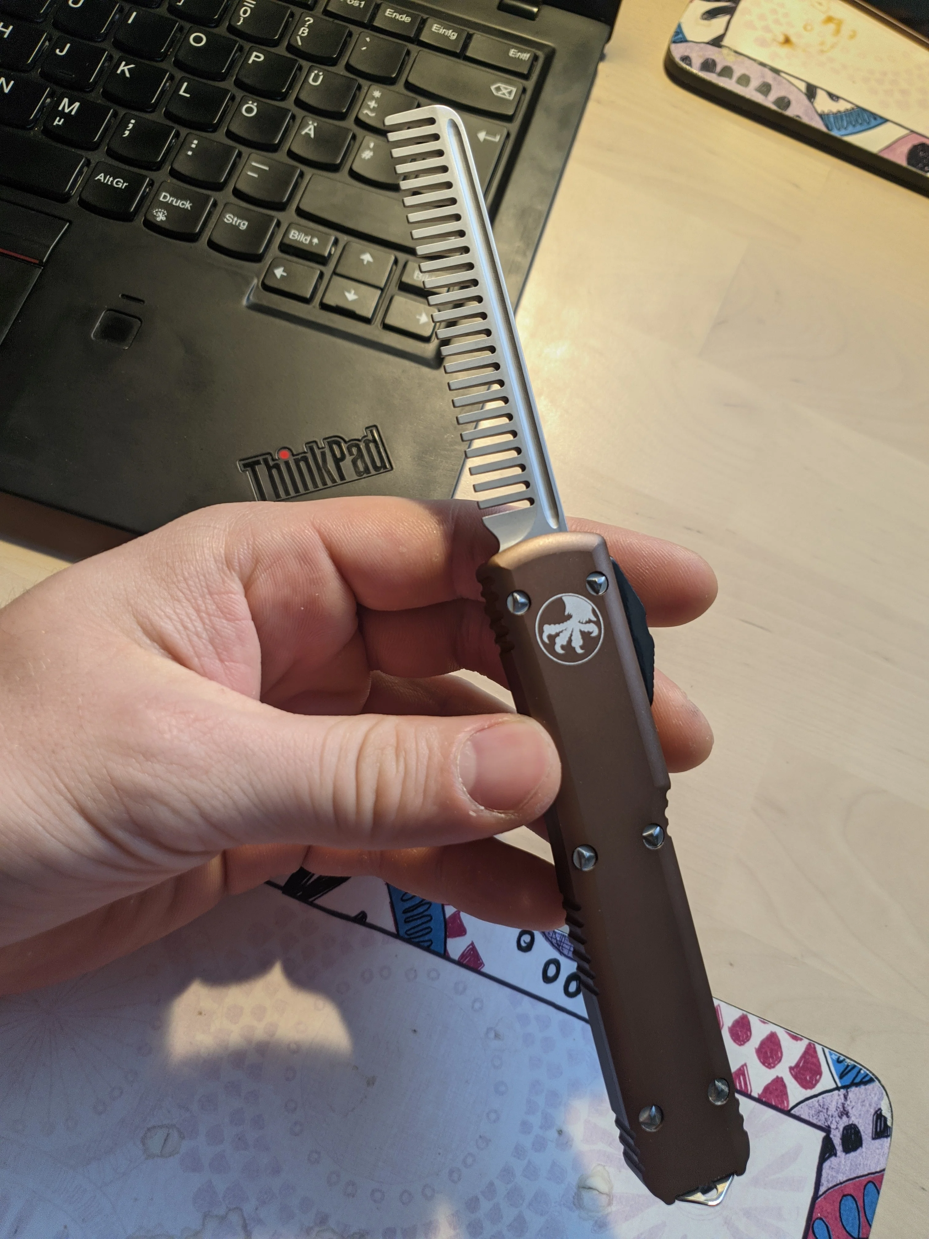 A tactical beard comb is a specialized grooming tool designed to help men maintain their beards in a neat and orderly fashion. It is typically made of metal and has a handle that is designed to fit comfortably in the hand. The comb has a series of teeth that are designed to help separate and untangle the hairs of the beard, allowing for a more even and uniform look. The comb can also be used to help shape and style the beard and remove any excess product or dirt.